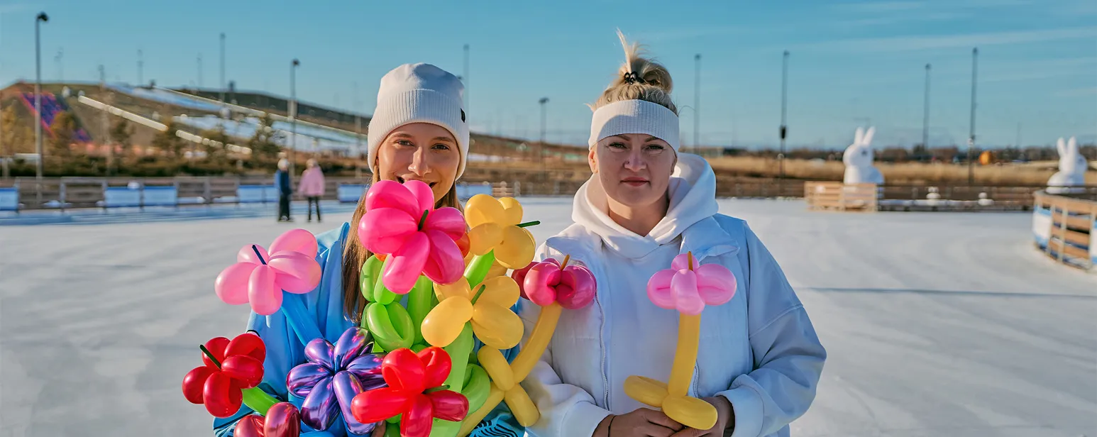- оригинальные цветочные композиции из воздушных шариков, которые стали ярким украшением мероприятия и порадовали гостей всех возрастов. А дарили их на нашем катке и вблизи него. А эмоции мам и бабушек запечатлел профессиональный фотограф.